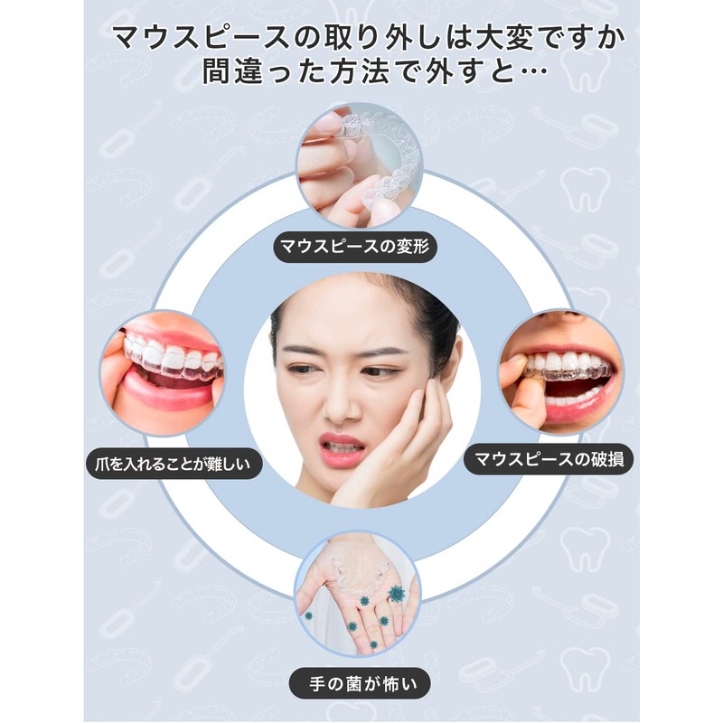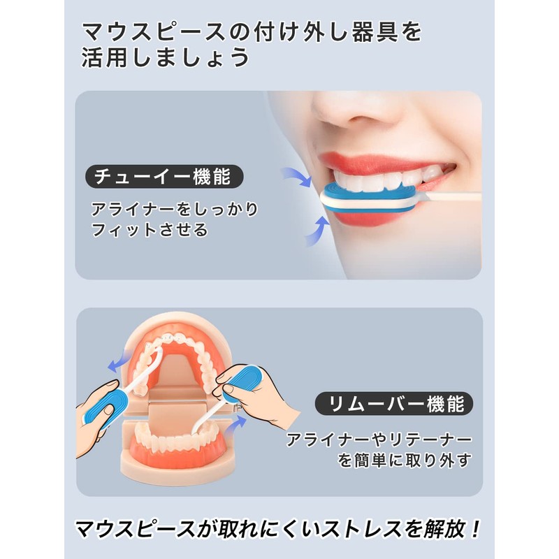 • 🦷🦷【マウスピースの付け外し器具2in1】 アライナーリムーバーや矯正チューイー機能の両立。目指しているキレイな歯並びへ近づきます。