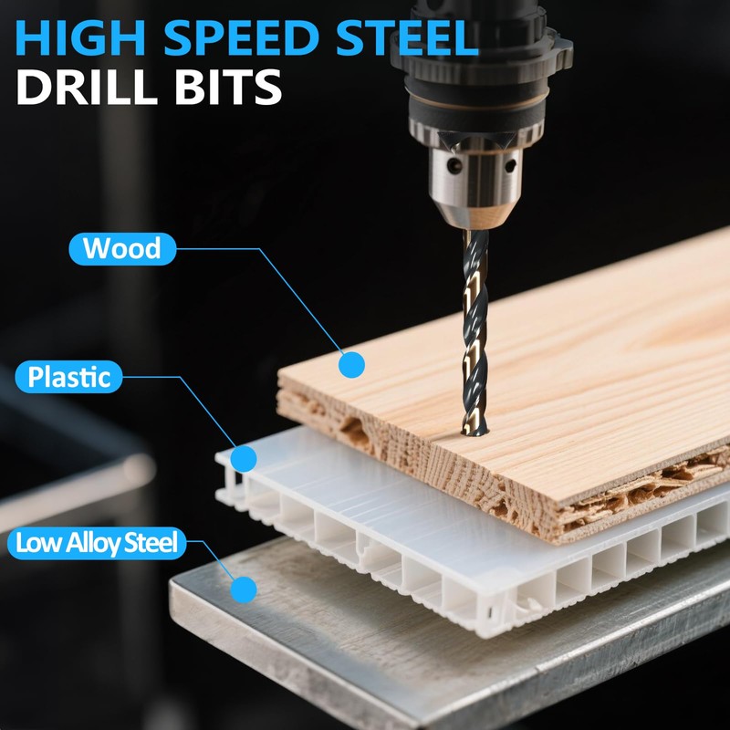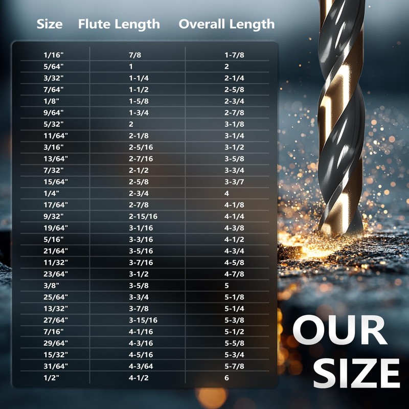 - 【Product Feature】: Twist drills are indicated in sizes. Assortment comes with a combined 29 sizes added:1/16", 5/64", 3/32", 7/64", 1/8", 9/64", 5/32", 11/64", 3/16", 13/64", 7/32", 15/64", 1/4", 17/64", 9/32", 19/64", 5/16", 21/64", 11/32", 23/64", 3/8",25/64",13/32",27/64",7/16",29/64",15/32",31/64",1/2"