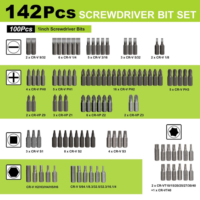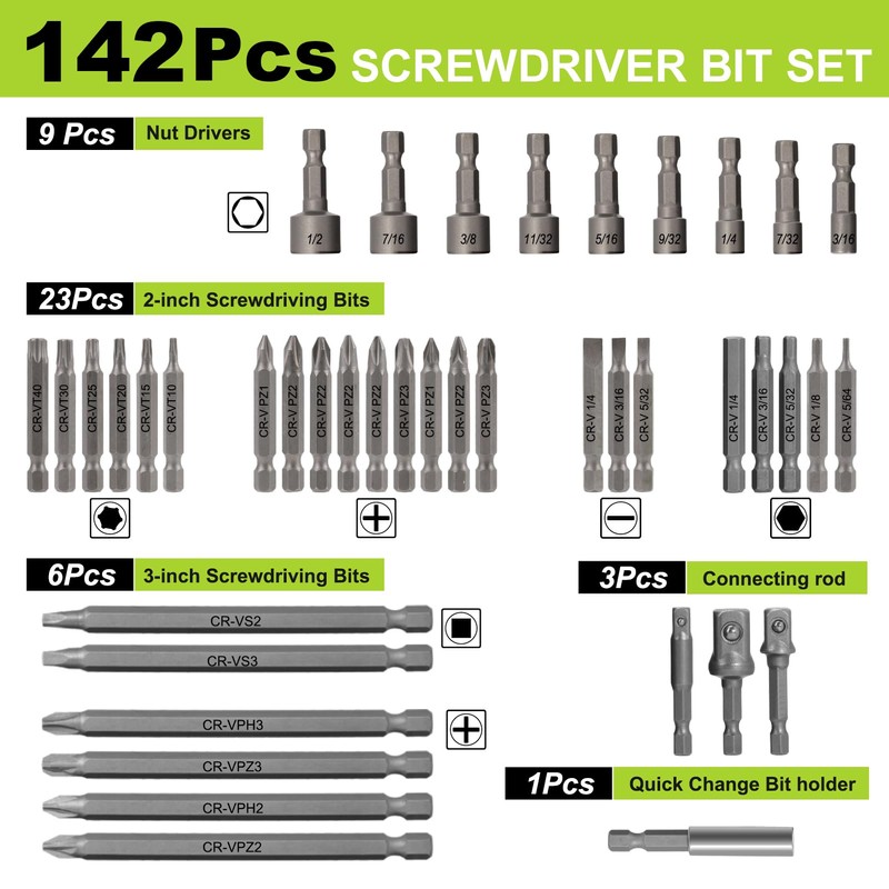 YOUGFIN Screwdriver Bit Set 142 Pieces, Chrome Vanadium Steel Driver Bits, Includes Nut Drivers, Magnetic Bit Holder, Adaptors