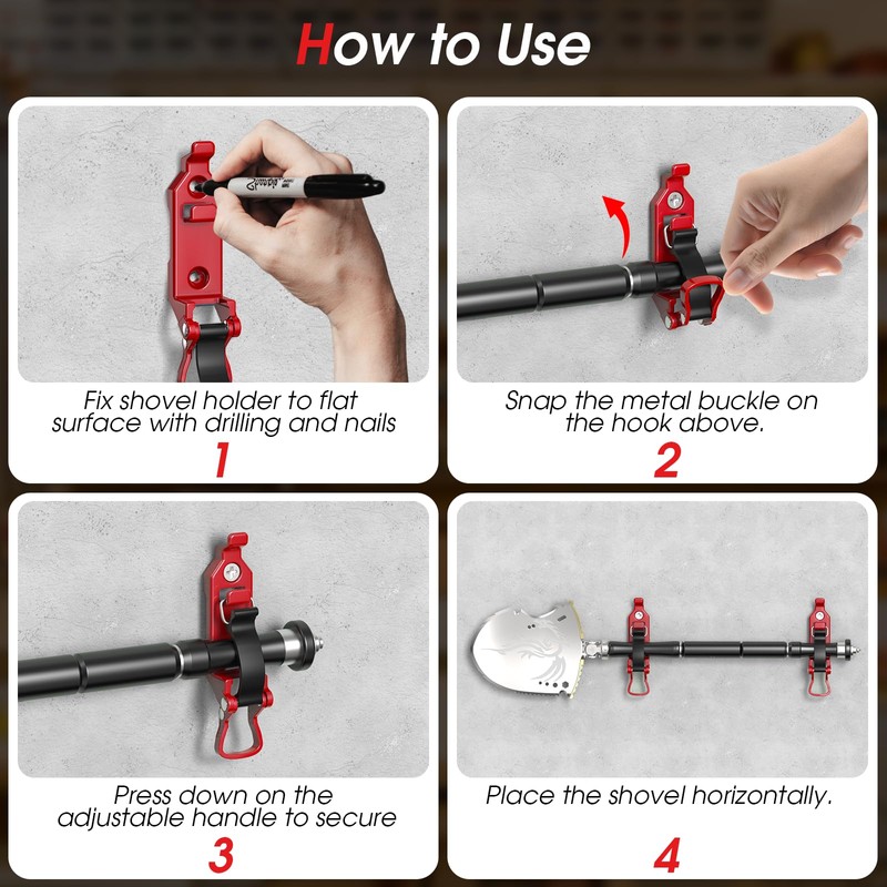 - Heavy Duty Metal Clamps: The upgraded metal clamps consist of iron brackets and rubber buckles for better weight-bearing capacity; This shovel holder holds the shovel tightly and stably both horizontally and vertically