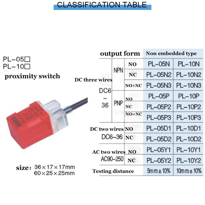 - Product Description: Product Name: Proximity Switch; Model: PL-05N; Type: NPN; Wire Type: DC 3 Wires (Black, Blue, Gray); Switch Appearance Type: Cylinder Type