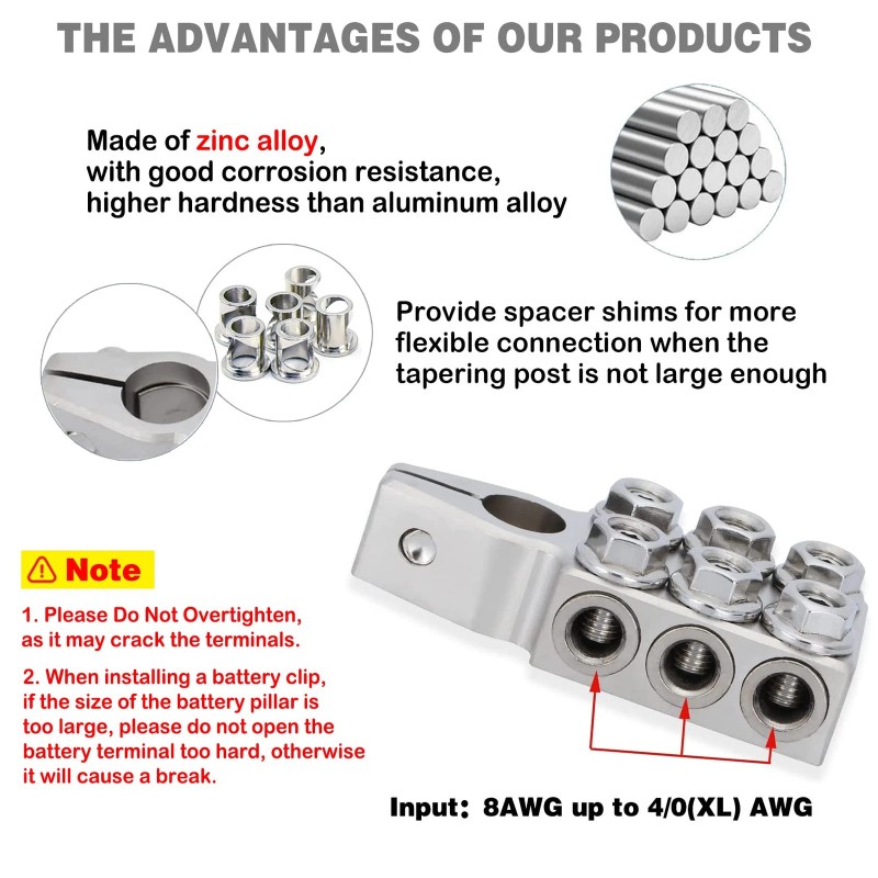 【High-quality material, sturdy and durable】 Made of high-quality Zinc alloy, with high precision, good toughness, and good corrosiveness, which can well protect the battery column from corrosion and prolong the battery life.