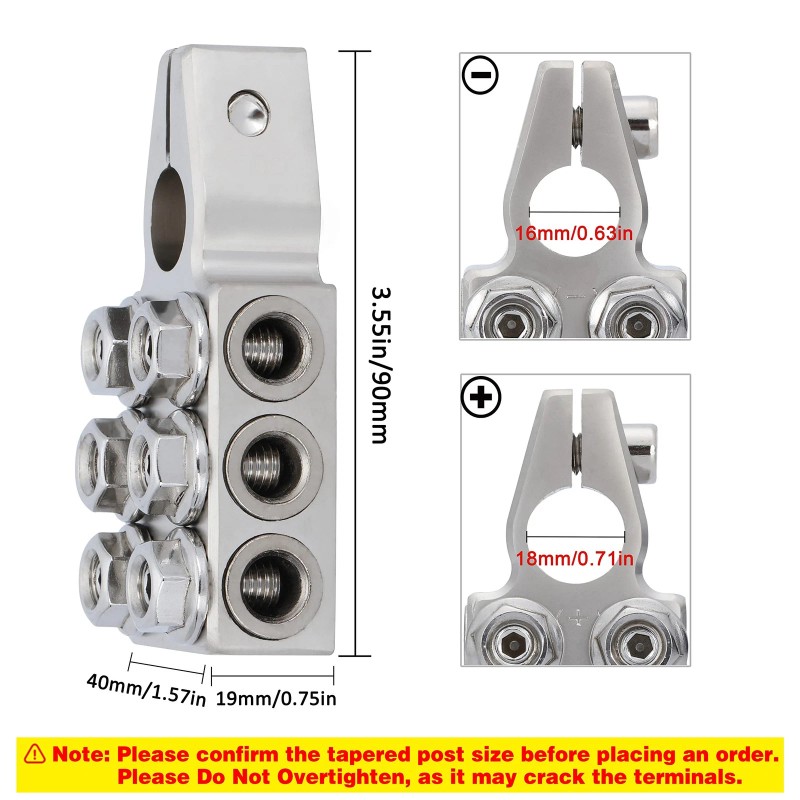 Battery type: Lead-acid (AGM, GEL, WET, MF, CA/CA) Taper post type: SAE / EN / DIN (but not JIS pencil post) Battery voltage: 48V, 36V, 24V, 12V, 6V Hole Holder Size Note: 2/0AWG wire diameter is 9.266 mm, hole holder diameter is sufficient to accommodate 2/0AWG wire