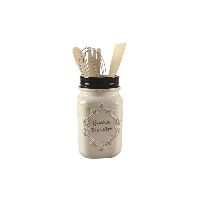 Young's Inc. 10.5" Ceramic tool holder w/tools. Trendy design from the farmers market that helps organize your kitchen utensils and inspires with "gather together" on the outside. Young's Inc. Was established in October 1988 and since then we have been providing quality giftware, home decor and trendy accessories. We have something for every room and for every style of decor to help you enhance any room, whether indoors or outdoors. Measures 4(l) 4(w) 10.5(h). Made from ceramic. Hand wash only. Stylish decorative accent for any room decor. Great gift for family, friends, neighbors and acquaintances.