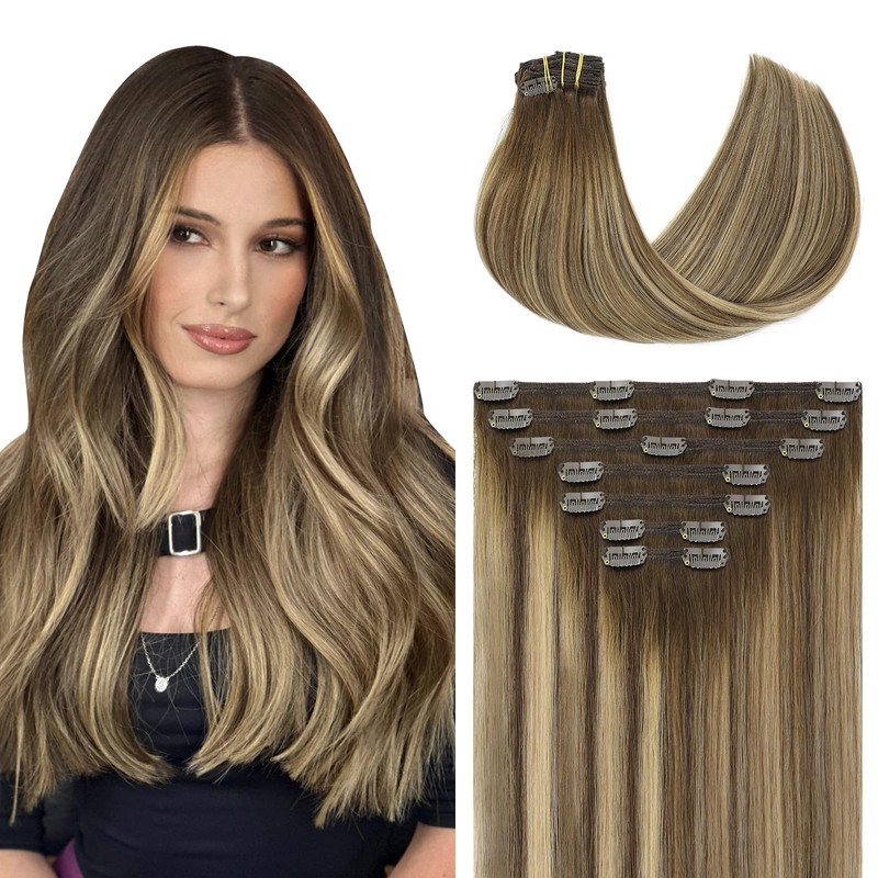 Youngsmile Clip in Hair Extensions, 16 Inch Chocolate Brown Mixed Caramel Blonde Balayage Hair Extensions Clip in East to Install 140g 7Pcs,Thick End,Soft Silk (7C#4/27/4-16Inch)