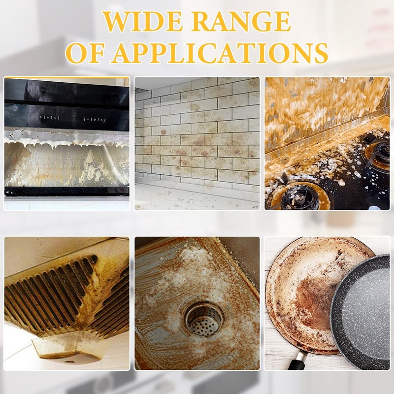 - Versatile Use: This kitchen grease cleaner has a wide range of applications and is perfect for cleaning pots, pans, stovetops, pans, floors, sinks, faucets, tiles, kitchen vents and more, leaving all surfaces looking like new.