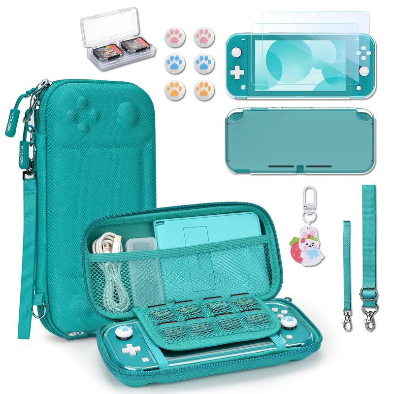 Younik Switch Lite Case, 14-in-1 Switch Lite Accessories with Switch Lite Bag, Clear Protective Case, Playing Card Case, 2 Screen Protectors, 6 Thumb Grips, Pendant, Turquoise Carry Case for Switch