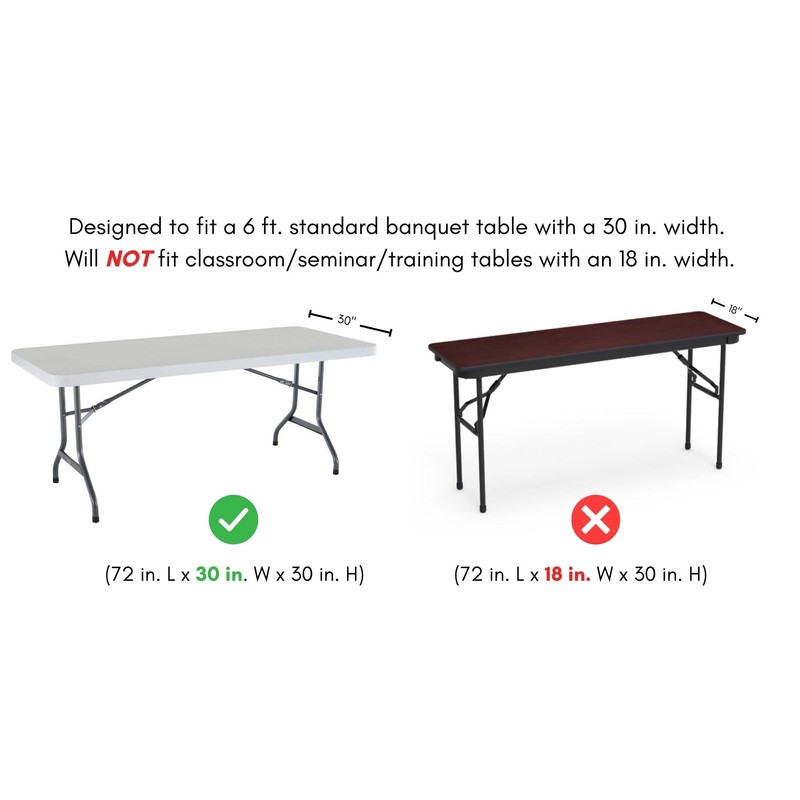 • Designed for tables measuring 72 inches or 6 feet in Length, 30 inches in Width, and 30 inches in Height. Feature deep elastic foot pockets, durable, do not require ironing, and can be laundered countless times.