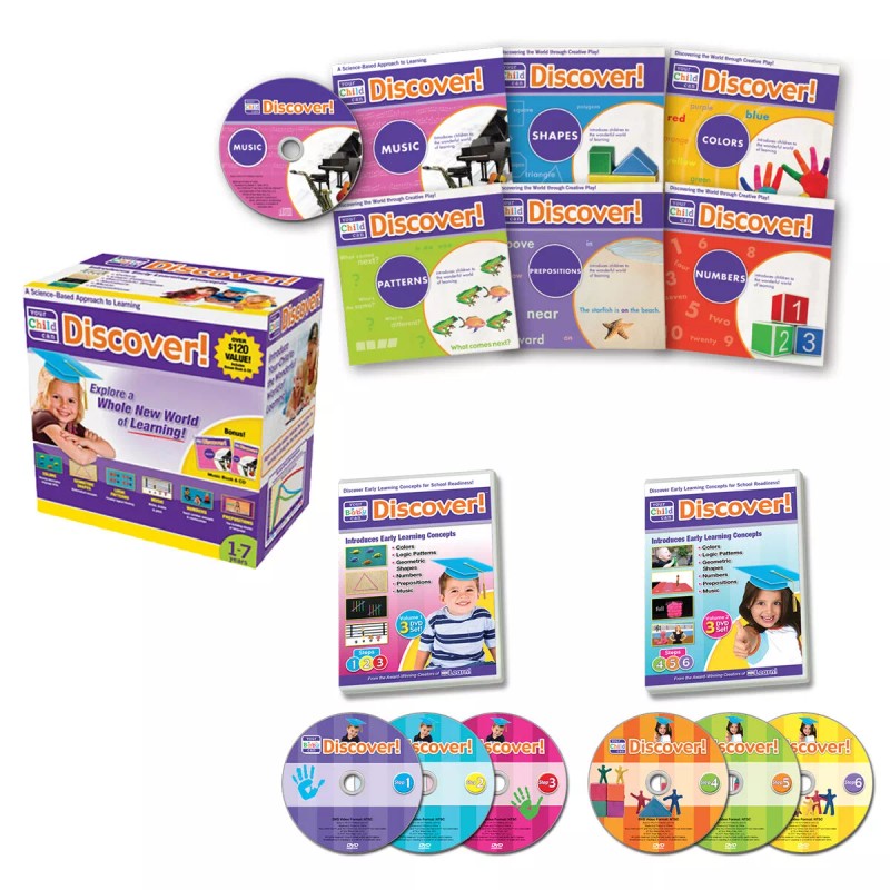 Your Child Can Discover! Math, Music, Colors, Shapes, Logic Patterns, and Prepositions! This deluxe kit includes all three Your Baby Can Discover! (YBCD) DVDs and all three Your Child Can Discover! (YCCD) DVDs along with the six Lift-the-Flap books and a bonus audio CD to go with the Music Lift-the-Flap Book. This is infant researcher Dr. Robert Titzer's newest and favorite series of videos and books. The DVDs, CD, and books are designed to teach pitch in music, 96 different colors, geometric shapes, logic patterns, math concepts, and much more! This highly entertaining program uses a multisensory, interactive approach that encourages the child to participate and learn. Each DVD covers all of the topics, and each subsequent volume goes deeper into the concepts. There is research showing that perfect pitch can be learned early in life, but this research was not conducted using Your Child Can Discover! Includes 6 DVDs, 6 Lift-the-Flap Books, and 1 music CD.