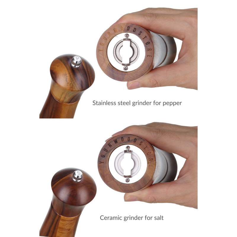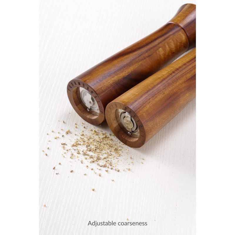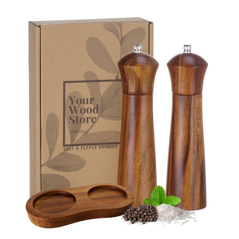 YourWoodStore Wooden Salt and Pepper Grinder Set with Tray, Plastic Free, Stainless Steel and Ceramic Grinder, Refillable, Adjustable Coarseness, Made from Solid Acacia Wood, Christmas Gift, 8 Inches