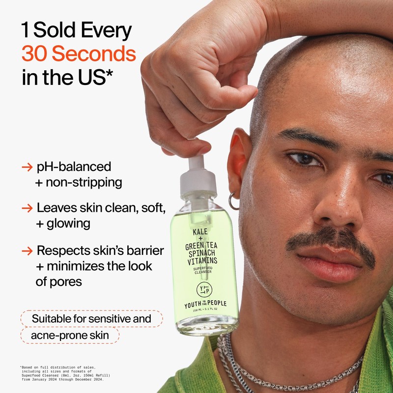 Youth To The People Superfood Facial Cleanser - Kale + Green Tea Daily Face Wash, Gentle Makeup Remover, Antioxidants for Glowing Skin & Less Visible Pores, Award-winning, Refillable - 8 Fl Oz