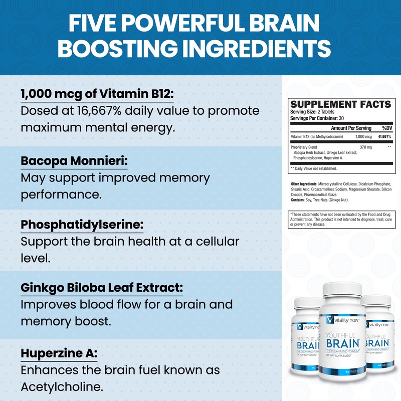 Vitality Now Youthful Brain | Memory & Brain Health Support Supplement - Brain Booster Clarity with Bacopa Monnieri, Ginkgo Biloba, B12 - Easy to Swallow Tablets - 30-Day Supply (60 Count)