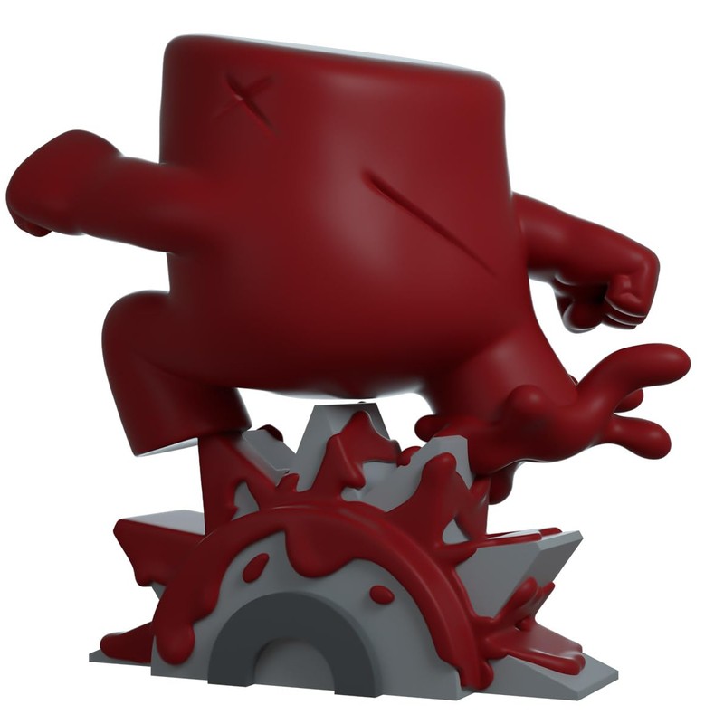 - Youtooz Super Meat Boy Vinyl Figure: The collectible stands 4 inches tall. The collectible shows Meat boy sitting on a blood-covered grey gear. He has a big toothy grin and fist pump to the sky, ready for adventure and ready to take down Dr.Fetus. The windowed display box has been decorated with a Meat Boy-esque level. Showing sharp saws sprinkled about. With a sprawling mountain scene fading into the background.