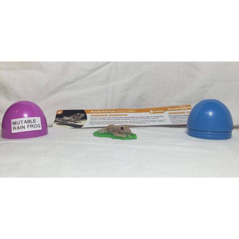 This listing is for 1 (one) Yowie Mutable Rain Frog collectible miniature figurine. This item measures approximately 2 1/4" x 3/4" x 1 1/12". It comes complete with its egg and accompanying pamphlet. There is no chocolate included with this listing.