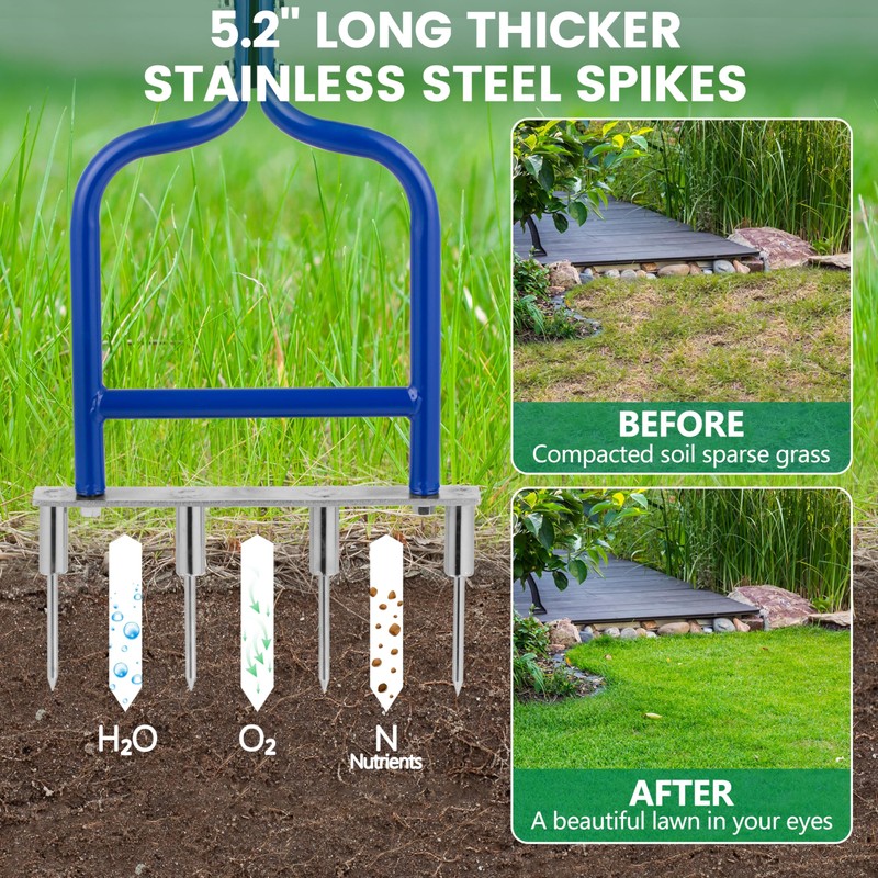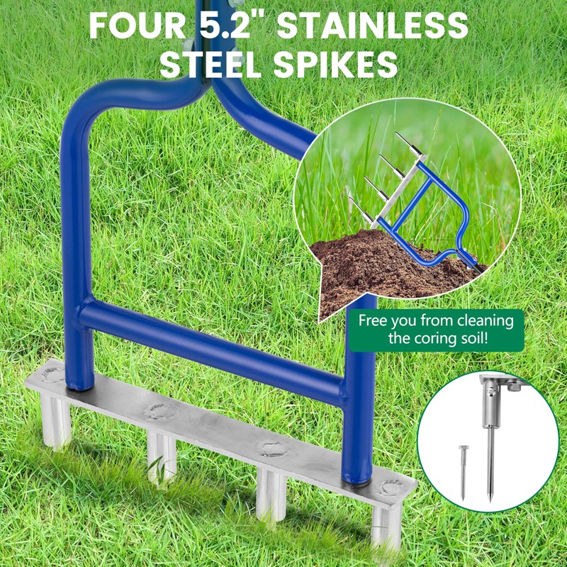 - Four 5.2'' Stainless Steel Spikes: The 4 solid, stainless steel spike tines penetrate deep into the ground without removing plugs of soil, making the core aerator lawn tool more efficient at aerating hard, dry soil, making it a faster, more effective lawn aerator tool.