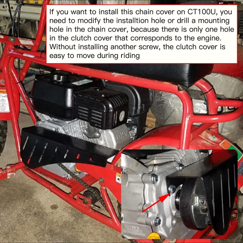 • [NOTE]-If you want to install this chain cover on Predator 212cc 196cc Coleman, Baja Massimo,Trailmaster, you must remove the jackshaft assembly. If you want to install this chain cover on CT100U, you need to modify the installtion hole or drill a mounting hole in the chain cover.