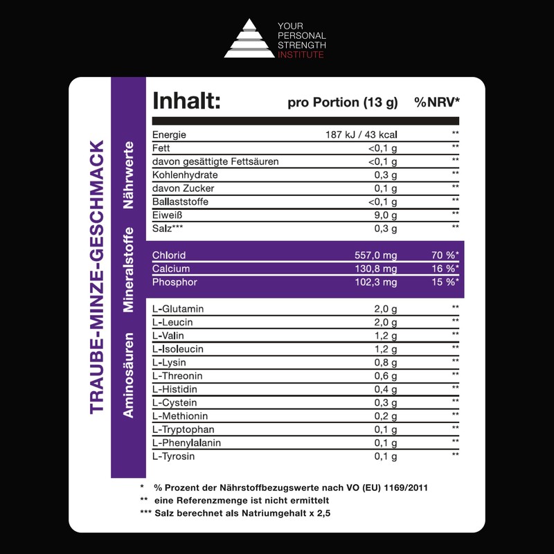 - Box contents and use: YPSI amino electrolyte complex. Vegan. Grape Mint Flavour 416 g tin. Amino acid powder with electrolytes such as phosphorus and calcium. Excellent soluble, simply shake briefly in the shaker. Without maltodextrin and sucrose.