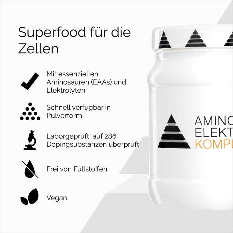 - Directly available: the finished drink contains pure amino acids that can be absorbed directly without splitting. The powder is vegan, contains important electrolytes and is free from fillers.