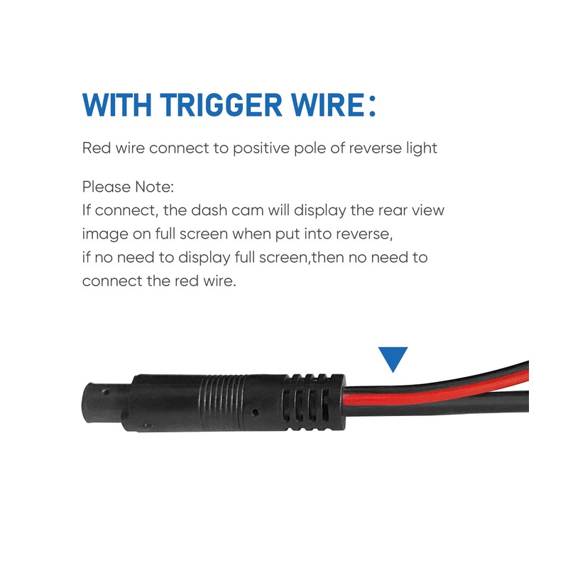 With Trigger Wire: This 4 pin camera cable with trigger wire should be connected to the backup light to get power, if connect, the dash cam will display the rear view image on full screen when put into reverse, if no need to display full screen,then no need to connect the red wire.