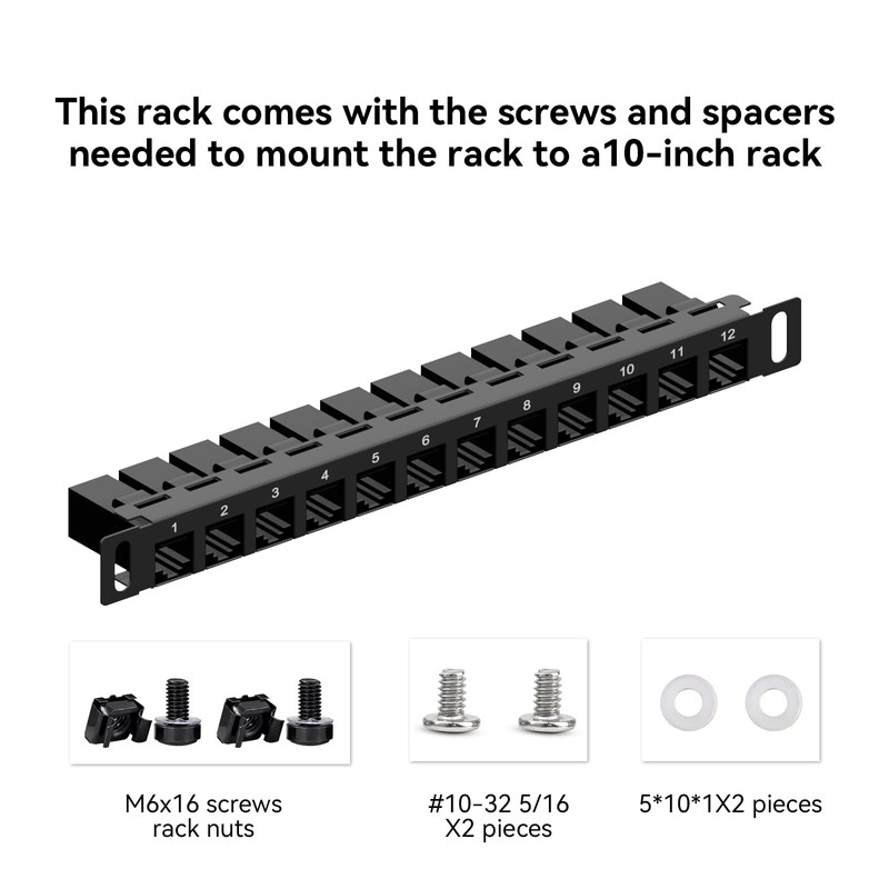 - The kit includes 1x12-port patch panel, 2xM6 Rack screws, 2xM6 Rack nuts, 2x screws, 2x washers.