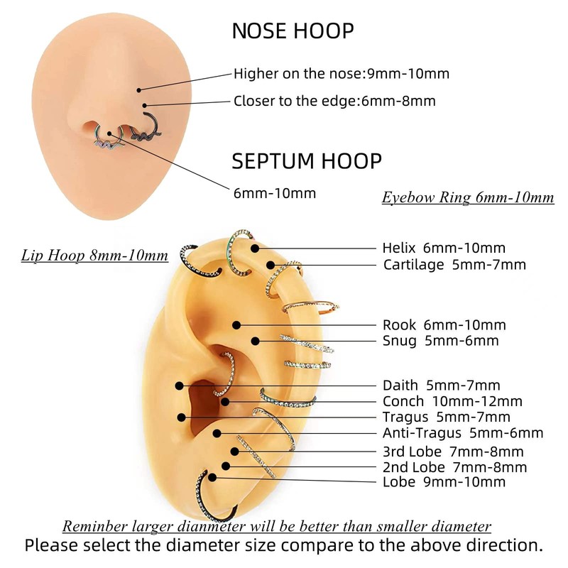 • Various Inner Diameter Usage Piercing Ring-6mm can be used for ear/nose/cartilage/snug/helix/rook/anti-tragus/eyebow/daith. 8mm-can be used for nose/ear/lip/cartilage/helix/rook/eyebow/septum/navel/tongue/nipple. 10mm-can be used for nose/ear/lip/cartilage/helix/rook/eyebow/septum/navel/tongue/nipple. 12mm-can be used for nose/ear/lip/cartilage/helix/rook/eyebow/septum/navel/tongue/nipple
