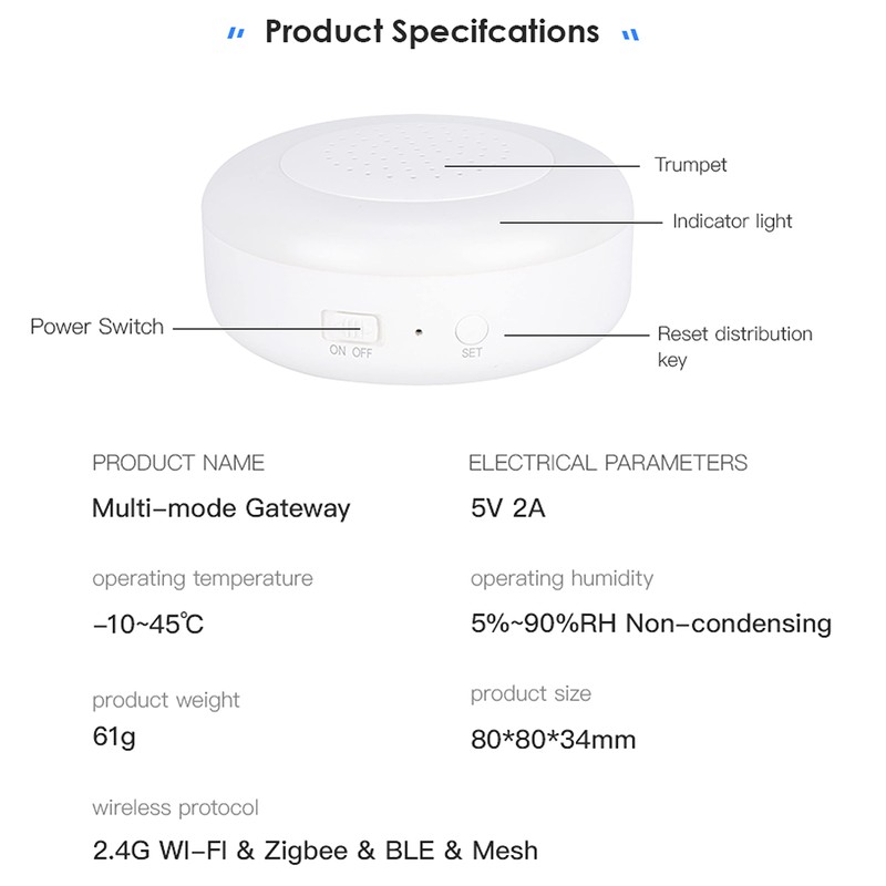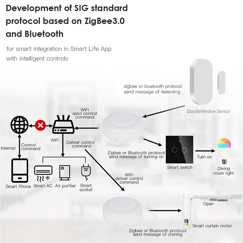 • 1. Unterstützung TUYA Sub Device Control: Unterstützen Sie Fernbedienung und Gruppensteuerung von Bluetooth und ZigBee Smart Devices, die in Smart Life Anwendungen angeschlossen sind, unterstützen Sie tuyaZigBee und Bluetooth Geräte, stabile Steuerung und leistungsstarke Leistung von 128 Geräten.