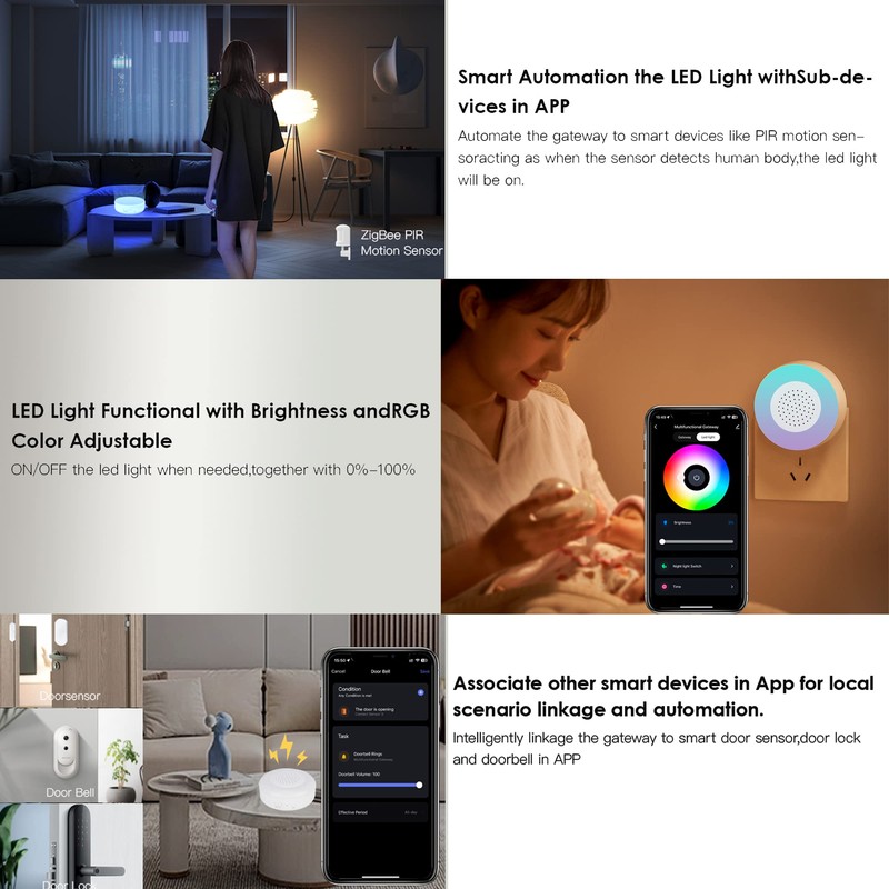 • 4.Eingebauter Ton- und Lichtwecker, Wecker, RGB-kleines Nachtlicht, Funktion, können Sie Ihr Nachtlicht fernsteuern, Helligkeit, kann von anderen Geräten ausgelöst werden, um das Nachtlicht oder die Alarmfunktion zu aktivieren, kann auch als Haustürklingel verwendet werden. Die Fähigkeit, Verteidigungen zu Hause zurückzuziehen und Verteidigungen im Freien aufzubauen, um die Sicherheit der Familie zu jeder Zeit zu gewährleisten