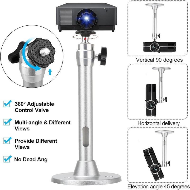- Multi-angle adjustment: tilt angle: 90 degrees; rotation angle: 360 degrees. Our projector mount with rotating head can be easily adjusted in different directions to meet your different requirements and achieve a perfect view.