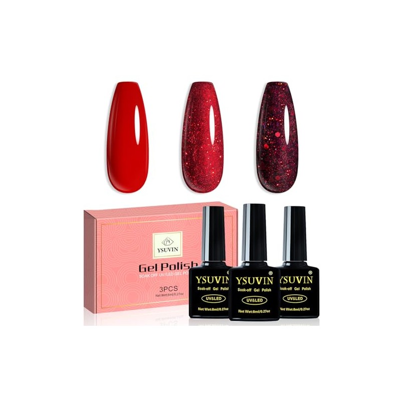 YSUVIN UV Nagellack Rot, 3 Farben Rot Glitzer Gel Nagellack Soak-Off UV Gellack für Frauen Home DIY Nail Art Maniküre Salon, Langlebig, 8ML