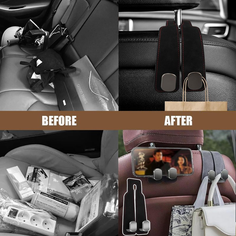 - Double Hook Design The car hook adopts a double hook design, which allows you to hang more items and save more space than the conventional single hook. The car bag hook can help you organise your car seats, say goodbye to messy car interiors and create a good mood.
