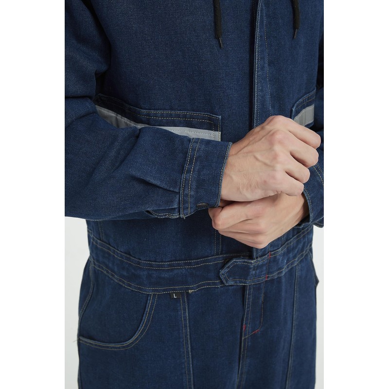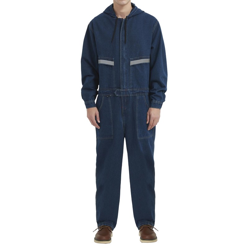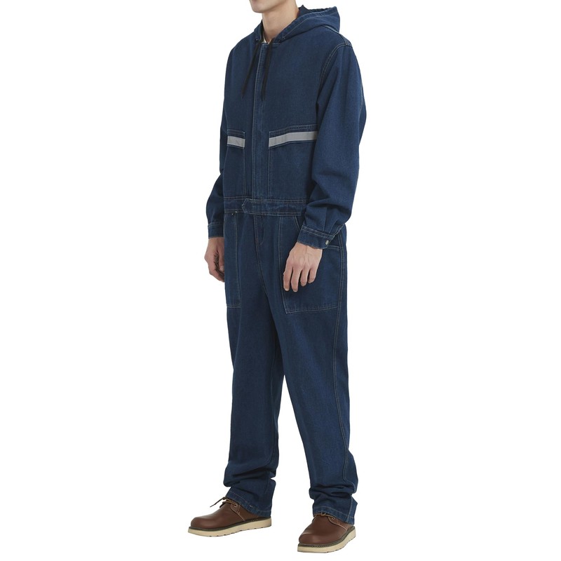 - FEATURES: Denim Fabric Hooded Work Jumpsuits. Hi-Vis Reflective tape. Heavyweight. Loose fit. Two Way Zip fastened to front of garment. Two chest pockets. Two swing pockets. Two back pockets. Designed for wearing all day in all flexible to adjust the size. Keeps your body fresh and comfortable. This coverall is NOT flame resistant.