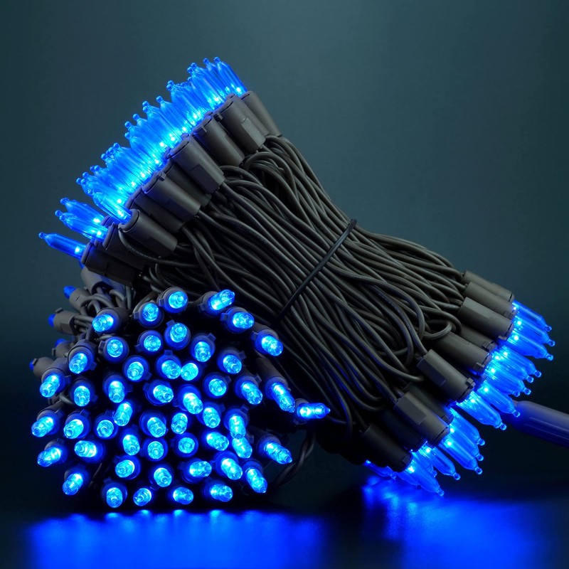 - Extra Long More Lights ♥ 200 blue LED bulbs on brown wire, 1 strand total length 66 feet. 4-inch spacing, 4-inch lead, 4-inch tail. With a tangle-free design and robust commercial grade 22 AWG wire with a pure copper core, installation is swift and professional. Waterproof design allows it to be used indoors and outdoors. The versatility of our malleable string lights is limitless: adorn Christmas trees, railings, stairs, fences, bushes, or shape them creatively to match your décor.