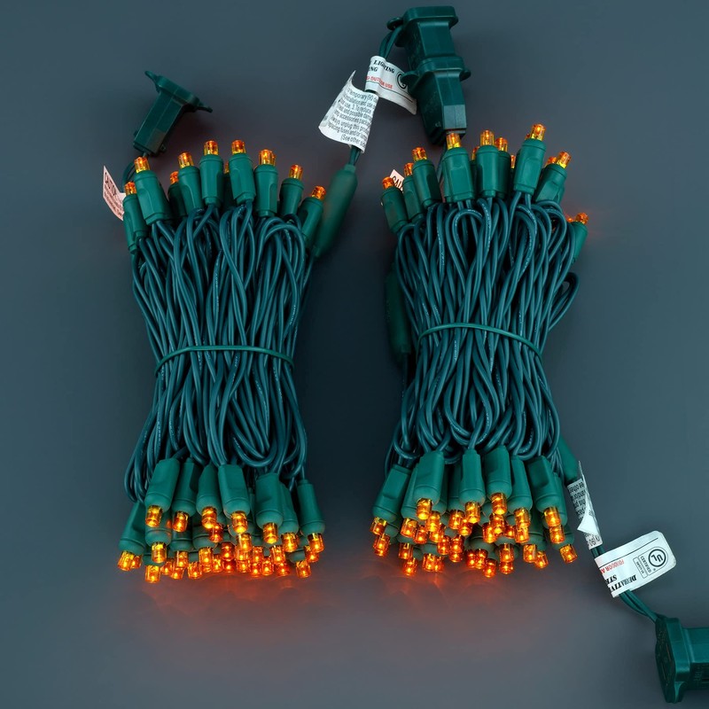 - SPECIFICATIONS ♥ 140 count orange 5mm wide angle LED bulbs on green wire, 48 ft. total length.2 strands of 70 lights in one package. 24-feet per strand, 4-inch spacing, 6-inch lead, 6-inch tail. It can be used with an end-to-end connection or two separate connections as needed.