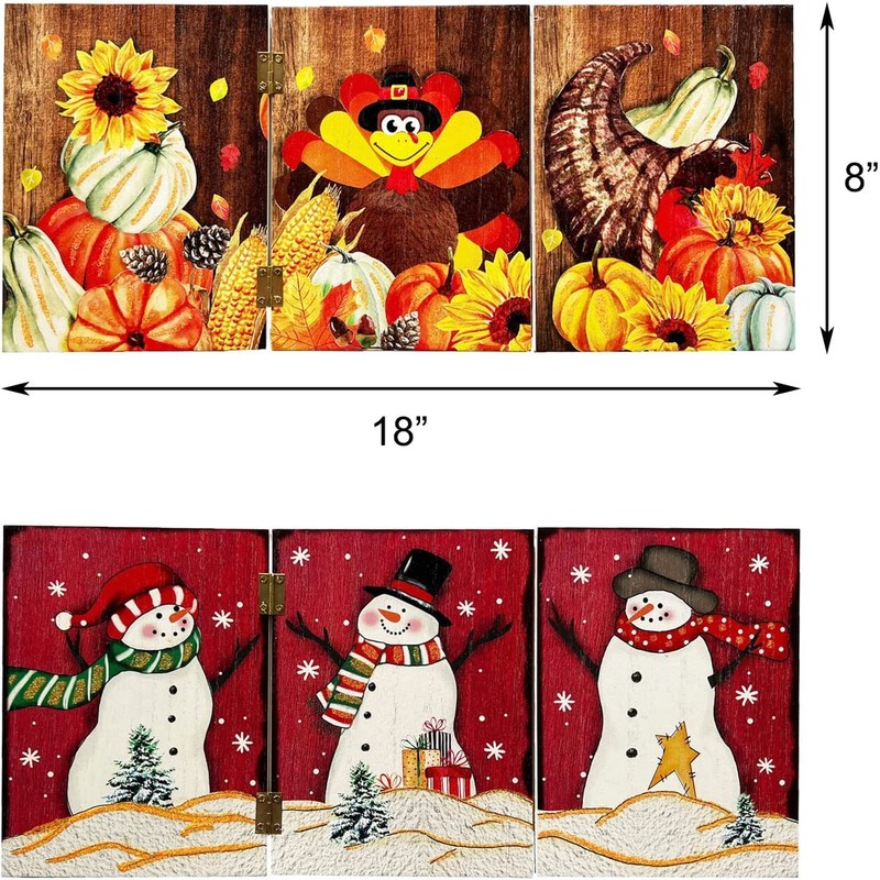 - Folding Turkey & Snowmen Fall Winter Indoor Decoration- One side features three cheerful snowmen with hats and scarves, the other side features pumpkins & turkey to welcome fall harvest!