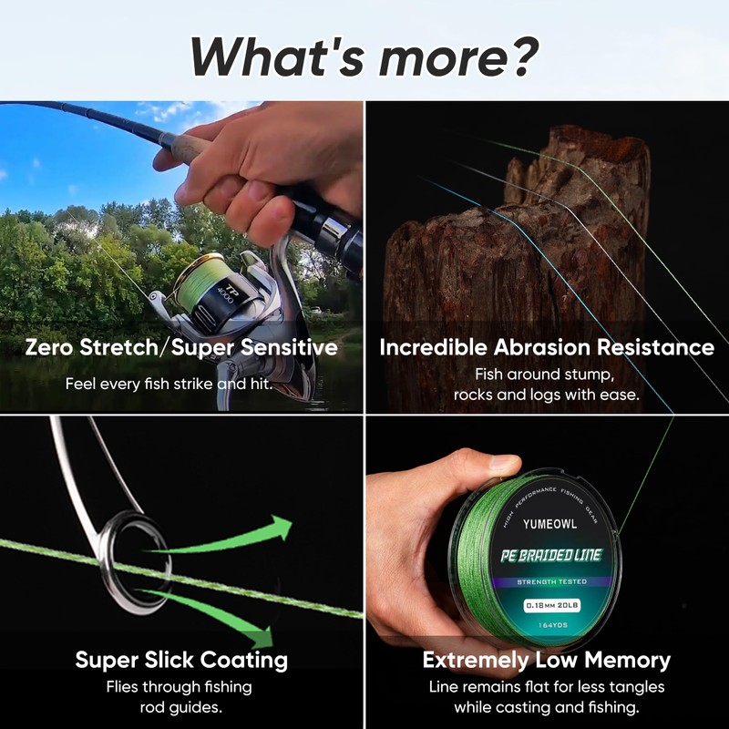 - Abrasion Resistant: YUMEOWL fishing line with special coating ensures its highly resistant to abrasion, making it durable and long-lasting even in rough conditions, such as rocky or snag-filled areas. Super slick coating let it easily slip and slide through the braided fishing rod guides and spool up quickly.