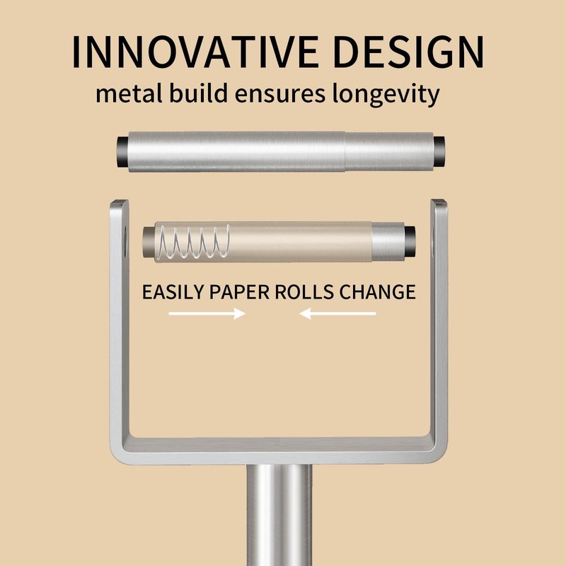 Sizes Measuring7.08" x 22.28".Designed with an enlarged base (7.08" ) for enhanced stability, this holder prevents tipping and ensures your toilet paper stays in place Easy to InstallNo drilling required – simply place the holder on any flat surface for a quick and easy setup Upgrade your bathroom with our Premium Stainless Steel Freestanding Toilet Paper Holder Detachable spring tube, allowing for easy replacement of toilet paper rolls and ensuring they remain securely in place