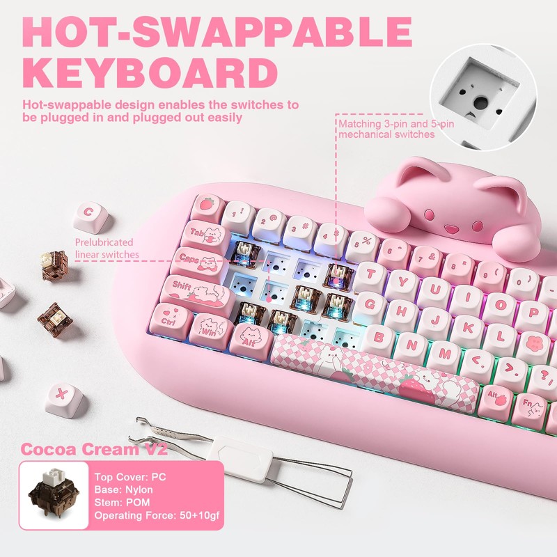 - 65% Layout, Adorable Cat-Inspired Design: YUNZII C68 wireless mechanical keyboard is a unique cute keyboard with YUNZII innovative kawaii cat design crafted from premium silicone material.The cat head of the keyboard is detachable.You can replace other head in future.The 65% layout 68 keys mechanical keyboard is compact and functional.This cute keyboard is suitable for home,office,workspace,outdoor,and casual games.