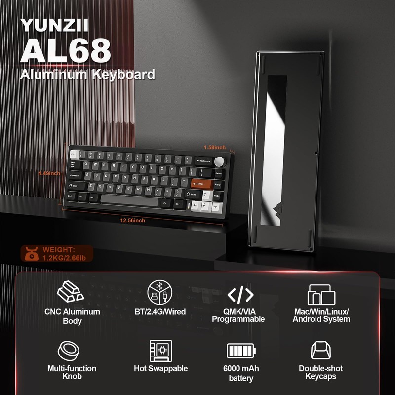 - Aluminum Mechanical Keyboard:YUNZII AL68 aluminum keyboard is crafted from premium anodized aluminum for unparalleled durability and a superior typing experience. This 60% keyboard features 66 keys and a metal knob for easy volume and RGB control. The glossy back panel and corrosion-resistant design make it ideal for both gamers and professionals seeking a high-quality, long-lasting mechanical gaming keyboard.