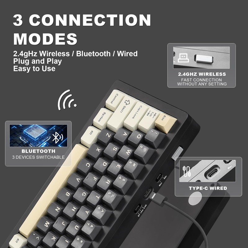 - 75% 71 Keys Mechanical Keyboard with Wireless/Wired: This hot swappable keyboard With built-in 4600mAh battery,this mechanical keyboard supports BT,2.4GHz and wired connection.No fussy connection steps,just toggle the side button to change the connection modes.Quickly switch between wireless connections on your PC,Mac,and more at the press of FN+Q/W/E.YUNZII AL71 portable keyboard make over desk during work,gaming,or carrying out. 2.4G wireless dongle and wired type c cable are included.