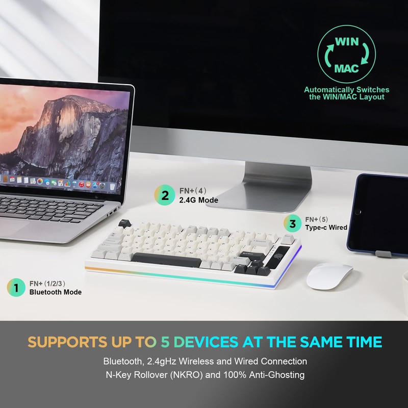- Multi-Device and Tri-Mode Wireless Connectivity - Bluetooth 5.0&2.4G&Type-C CableEquipped with a 5000 mAh capacity battery, YUNZII YZ75 keyboard support Bluetooth, 2.4G wireless and wired connection. Compatible with Laptop, iPad, IOS, Windows, Mac or Android. No fussy connection process, the wireless connection is quick and stable. Fn+Space can check the battery capacity anytime. 2.4G wireless dongle and wired cable are included.