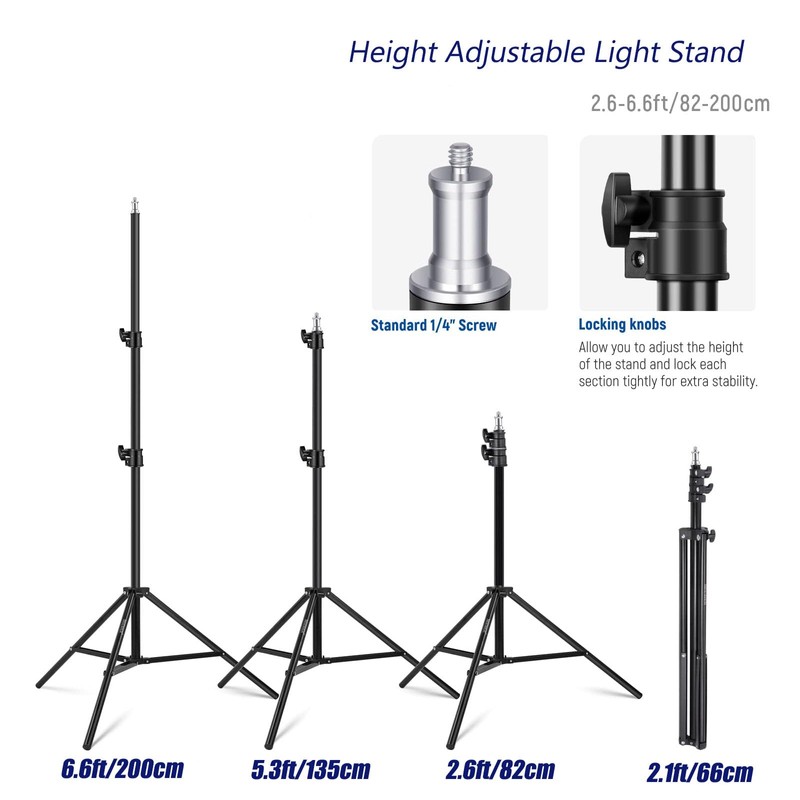 - 【Height Adjustable Tripod Stand】Adjustable from 2.6ft/82cm to 6.6ft/200cm, the tripod light stand provides stable support for reflector, softbox, light, and other filming equipment. Easily mount the holder arm on the tripod stand and lock tight with a side securing knob.