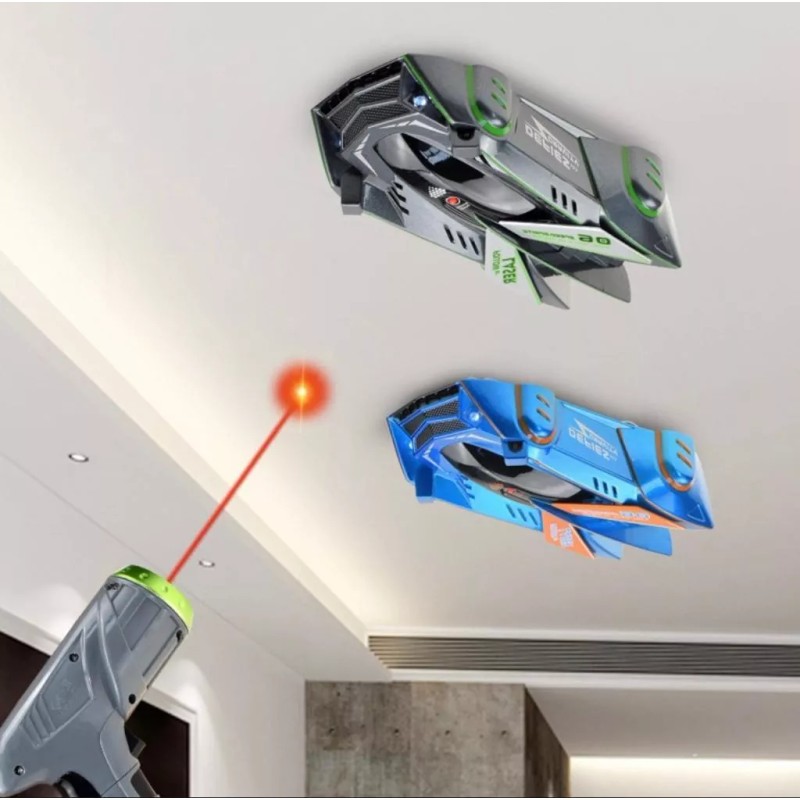Persigue la luz láser LED: utiliza el controlador de pistola láser para apuntar el haz de luz láser en la pared, techo o suelo, y el auto de carreras láser de gravedad cero perseguirá la luz en cualquier dirección