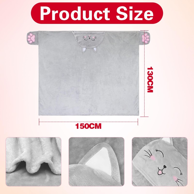 Unique cat hood and paw design, cute animal cartoon design, make the cuddly blanket with sleeves look very cute.