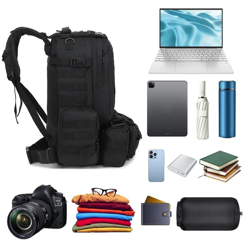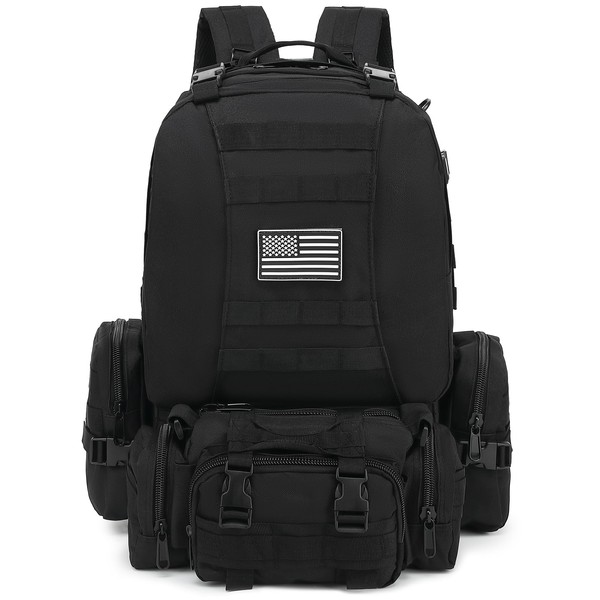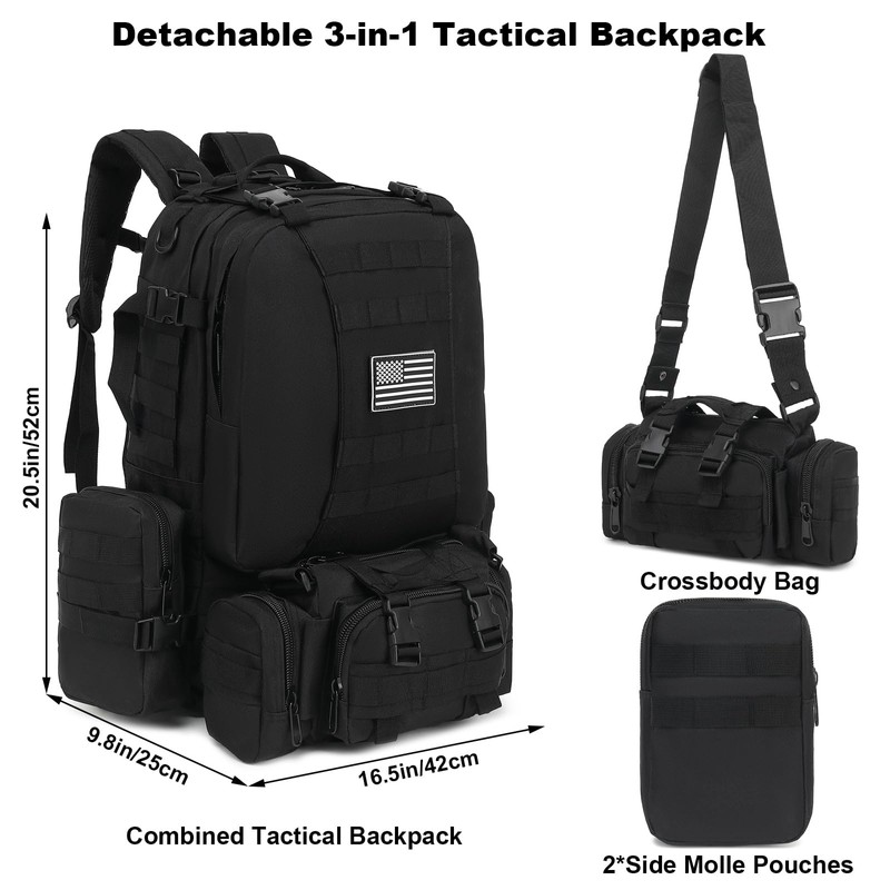 - Large Capacity: 16.5" x 9.8" x 20.5"(LxDxH), 55L. Tactical backpack includes a large main compartment, a front detachable bag which you can use as a functional crossbody bag separately, two side detachable molle pouches.