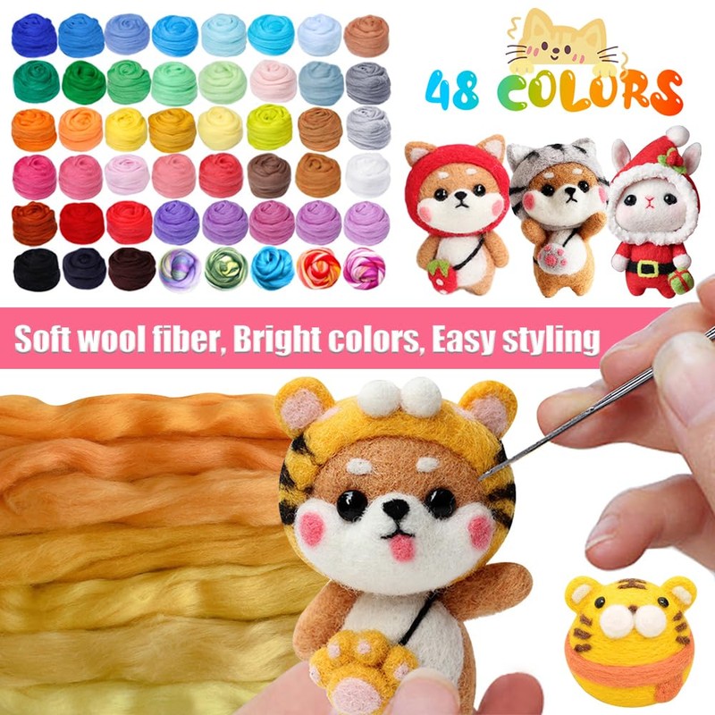 - 48 colours of felted wool: Our roving felting contains 48 different colours of felted wool, which are suitable for different types of needle felting. You can do wool felting, needle felting, dry felting, knitting, decorating and many types of crafts, perfect for DIY wool felt sets and DIY wool crafts.