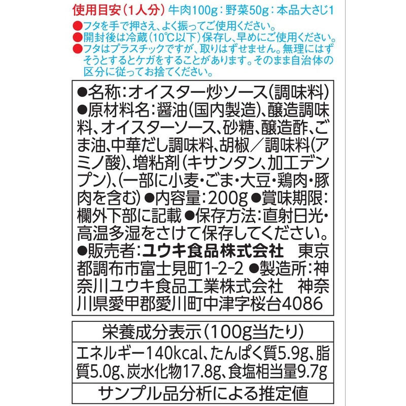 - Ingredients: Soy sauce (made in Japan), brewing seasoning, oyster sauce, sugar, brewed vinegar, sesame oil, Chinese soup seasoning, pepper/seasoning (amino acid), thickening agent (xanthan, processed starch), some parts include wheat, sesame, soy, chicken, pork