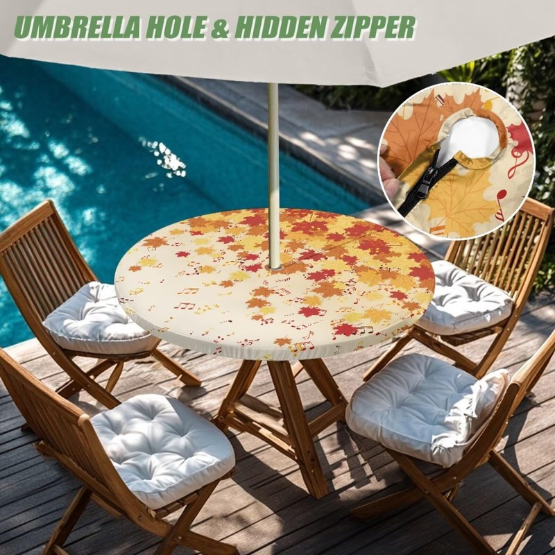 YUVAMAGIMO Round Fitted Tablecloth with Maple Leaves Elastic Outdoor Patio Tablecloth with Umbrella Hole and Zipper Machine Washable Round Table Cover Fall Decorations for Home