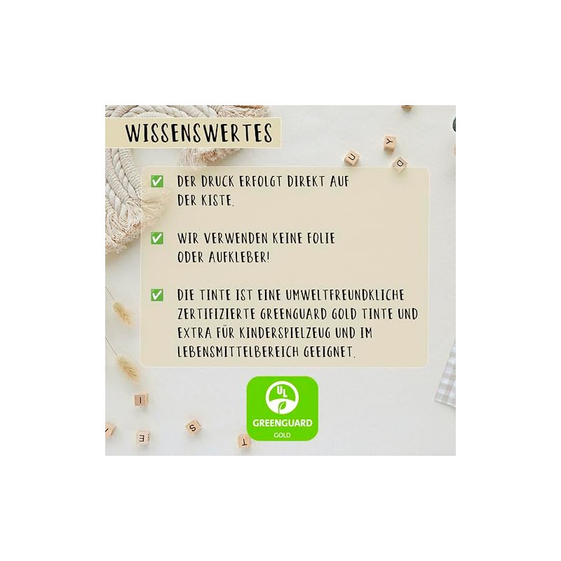Personalisierte Erinnerungsbox aus hochwertigem Holz – ein wunderbares Geschenk zur Jugendweihe. Die Erinnerungskiste bietet ausreichend Platz für besondere Erinnerungsstücke. Die Holzkiste eignet sich auch hervorragend zur Aufbewahrung von Fotos und ist eine dekorative Ergänzung. Es stehen zwei Größen zur Auswahl: Kleine Erinnerungskiste in Größe S, Maße: 20 x 15 x 10 cm, mit Klappdeckel. Große Erinnerungskiste in Größe M, Maße: 30 x 20x 14 cm, mit Klappdeckel. Die Baby-Erinnerungskiste besteht aus hochwertigem Kiefernholz. Für die Personalisierung verwenden wir keine Folie oder Aufkleber, sondern unsere selbst entworfenen Tiermotive werden mittels Spezialdruckverfahren umweltfreundlich auf das Holz aufgebracht. Die verwendete Tinte ist GREENGUARD Gold zertifiziert und daher auch für Kinderspielzeug geeignet. Mit einer individuellen Holzerinnerungskiste hast du immer ein praktisches und persönliches Geschenk zur Hand. Ideal als besonderes Jugendweihe Geschenk. Die Holzerinnerungskiste ist perfekt als: Geschenk zur Jugendweihe. Im Lieferumfang enthalten ist eine personalisierte Erinnerungskiste – ohne Dekoration. Weitere großartige Erinnerungsboxen findest du hier: Aufgrund der natürlichen Eigenschaften handelt es sich bei jedem Produkt um ein Unikat, und aufgrund der Individualisierung ist der Umtausch ausgeschlossen. Holz ist ein schönes Naturprodukt, daher können Farbunterschiede, Maserungen sowie Gravurhelligkeit und -tiefe variieren. Diese holzbedingten Abweichungen gelten nicht als Grund für Reklamationen!