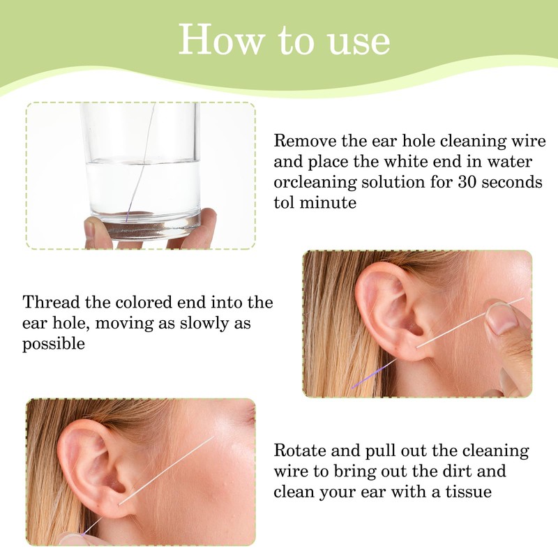 Function: Using the ear piercing wire care kit is quick and easy. Cleaning ear holes, removing odors, preventing blockages, and bathing ear holes are easy. When using, just wet the ear piercing wire and put it into your own ear hole for cleaning.