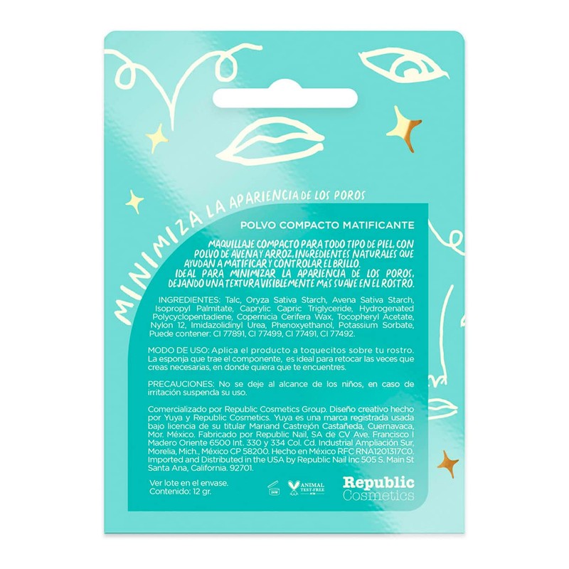 Maquillaje compacto con polvo de Avena y Arroz, ingredientes naturales que ayudan a matificar y controlar el brillo, Minimiza la apariencia de los poros, enrojecimiento y manchas, para todo tipo de piel. Con un acabado mate aterciopelado para disminuir el exceso de brillo.